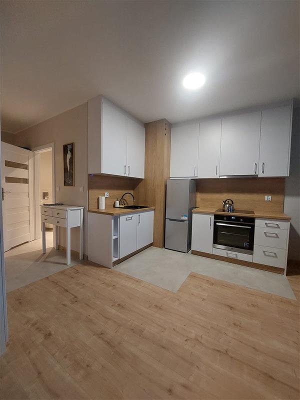 aneks kuchenny z nowoczesnymi sprzętami AGD (lodówka, płyta indukcyjna, piekarnik, zmywarka)