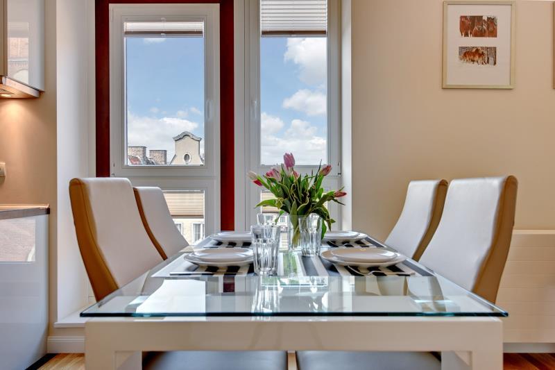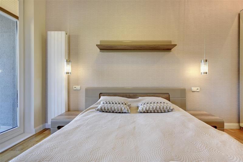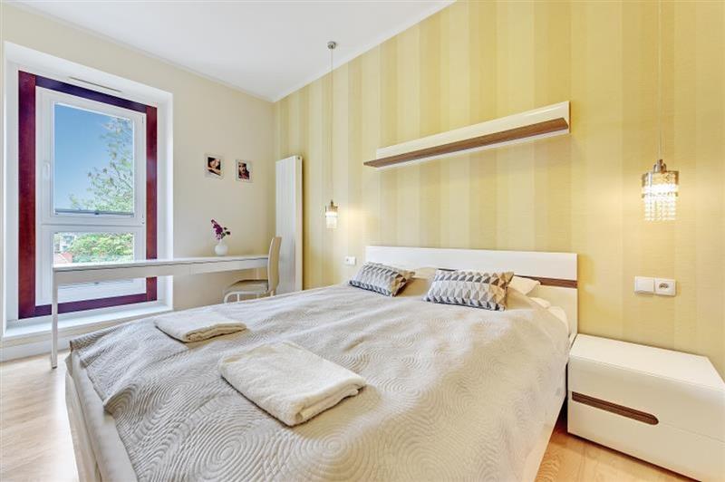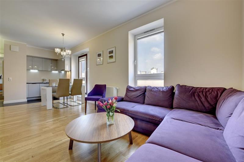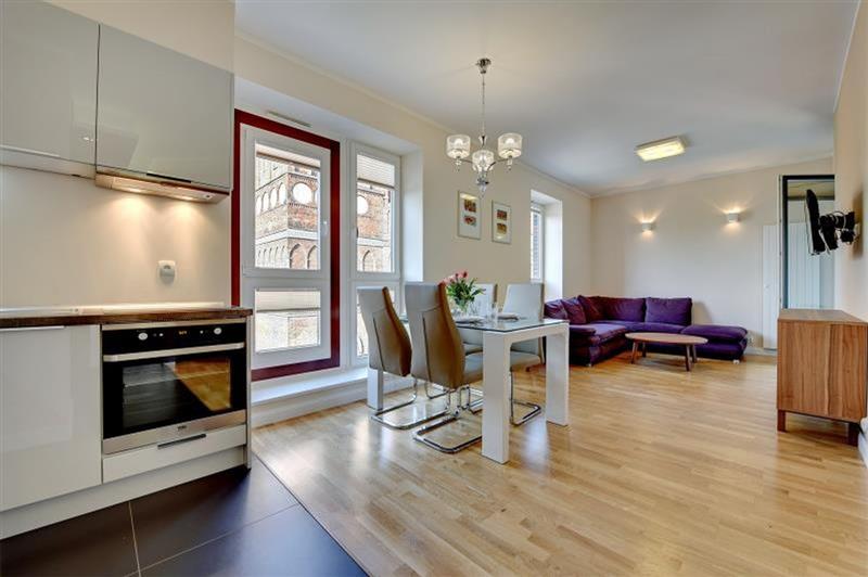 Mieszkanie o pow. 48 m2, znajduje się na trzecim piętrze. Mieszkanie wykończone w wysokim standardzie, w pełni umeblowane oraz wyposażone Jasny salon połączony z kuchnią tworzy przestronną część dzienną- wyposażoną w komfortowy komplet wypoczynkowy, stół jadalniany oraz duży telewizor LCD. Kuchnię tworzy aneks zaprojektowany na wymiar oraz pełne wyposażenie AGD: lodówka, piekarnik, zmywarka, mikrofalówka, płyta indukcyjna.