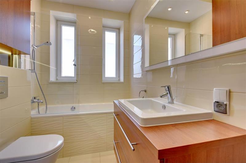 Komfortowa łazienka, całkowicie wyposażona: meble w zabudowie, duża wanna oraz pralka.