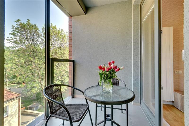 Balkon, do którego dostęp mamy z salonu z ładnym widokiem i miejscem na odpoczynek