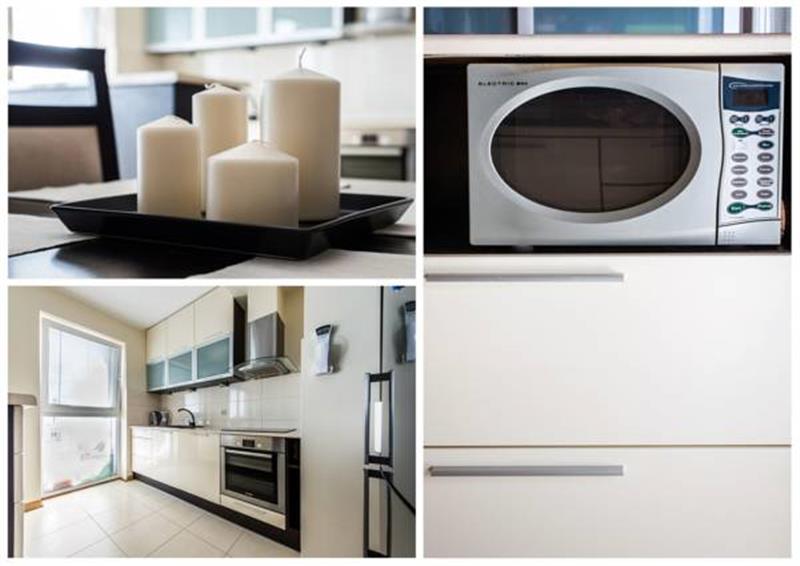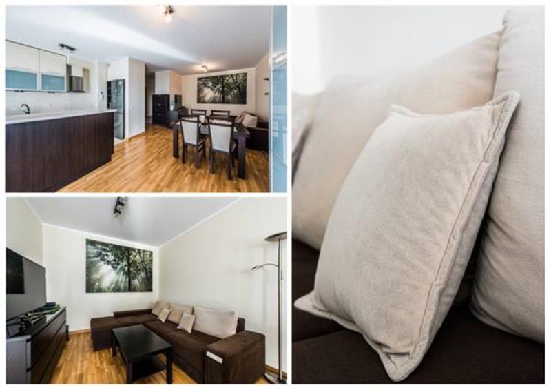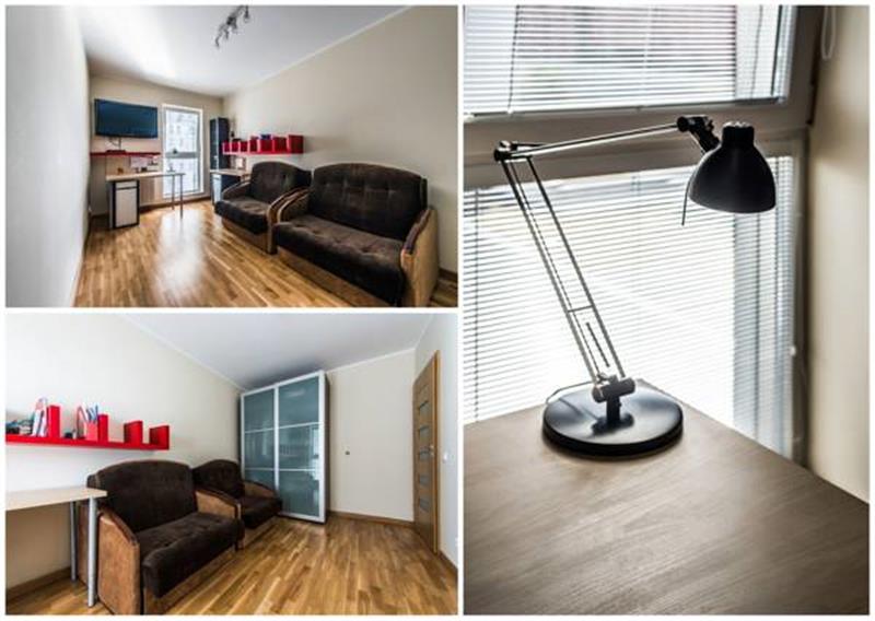 Lokal: Salon wyposażony m. in. w dwuosobową rozkładaną sofę, telewizor, stół z krzesłami. Aneks kuchenny wyposażony w niezbędne urządzenia AGD. Sypialnia wyposażona w podwójne łóżko dwuosobowa i szafę. Łazienka wyposażona w duży prysznic i pralkę. W przedpokoju garderoba. Do lokalu przynależy balkon, na który wychodzi się z salonu.