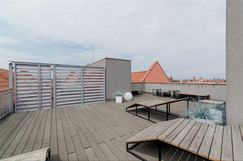Taras widokowy na dachu z panoramą na dachy gdańskiej Starówki,