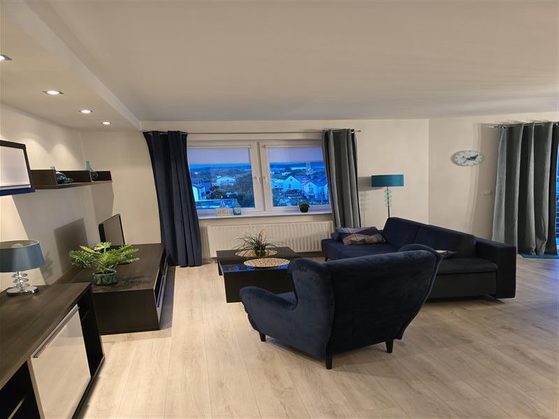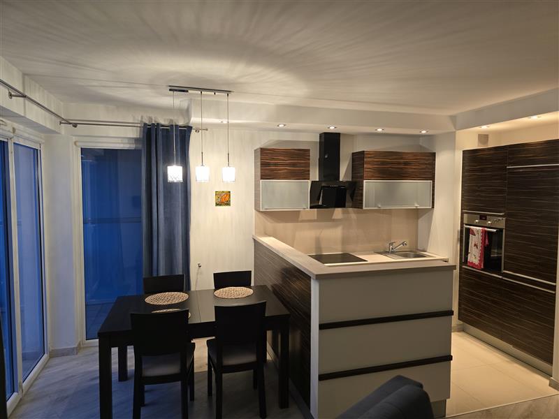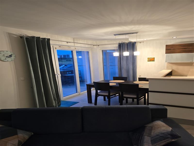 Apartament o powierzchni 71 m2 składa się z sypialni, pokoju, pokoju dziennego z aneksem kuchennym oraz łazienki. Pokój dzienny wyposażony jest w dwuosobową rozkładaną sofę. Kuchnia kompletnie wyposażona w tym m. in. sprzęt AGD: płyta elektryczna, piekarnik, lodówka z zamrażalką, zmywarka. Osobna sypialnia, a w niej łóżko małżeńskie oraz pokoju. Łazienka z prysznicem i pralką. Z salonu oraz sypialni wyjście na odrębny balkon.