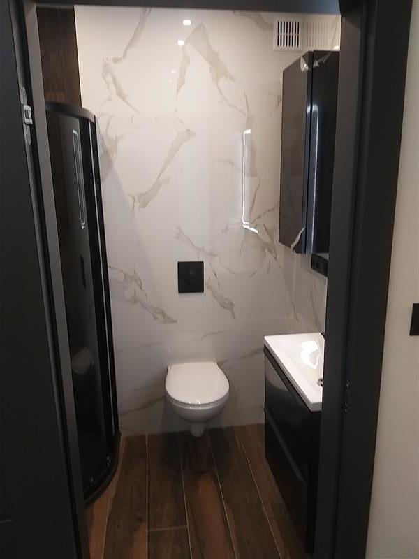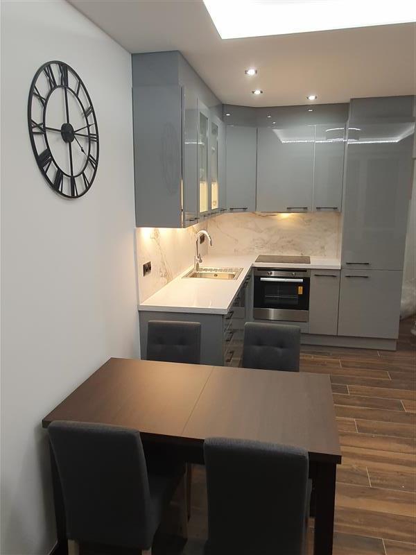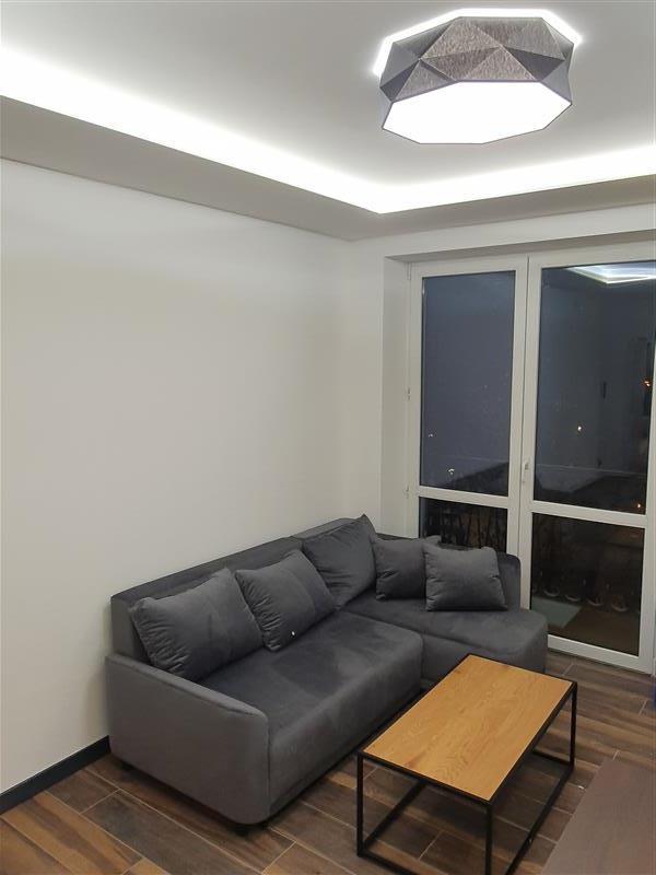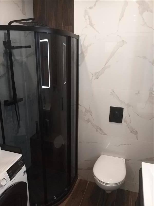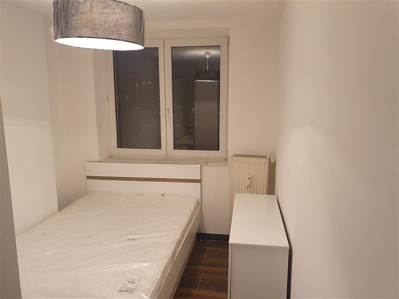 Mieszkanie zlokalizowane na 3 piętrze. Lokal składa się z salonu połączonego z aneksem kuchennym, sypialni, pokoju dziennego, łazienki i przedpokoju. Do lokalu przynależy balkon. W sypialni łoże małżeńskie, szafki nocne i szafa. W kuchni zabudowa kuchenna oraz sprzęt AGD: lodówka, zmywarka, kuchenka elektryczna z piekarnikiem. Łazienka z kabiną prysznicową. Na wyposażeniu jest pralka, deska do prasowania oraz inne niezbędne sprzęty. Mieszkanie nowe, jasne, ciepłe i zadbane.