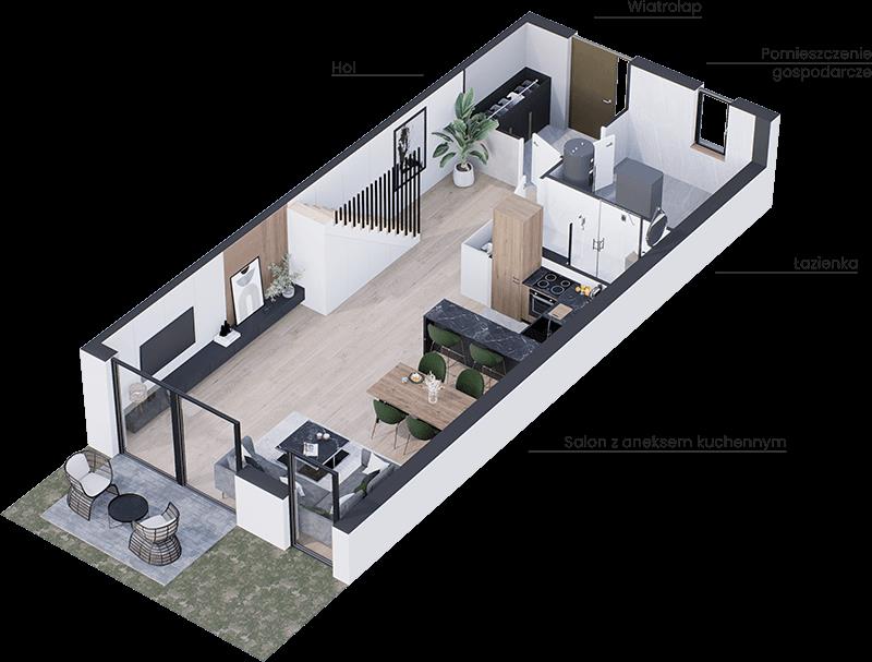 Każdy dom został zaprojektowany z dbałością o najmniejsze detale i oferuje 112,64 m2 powierzchni użytkowej.